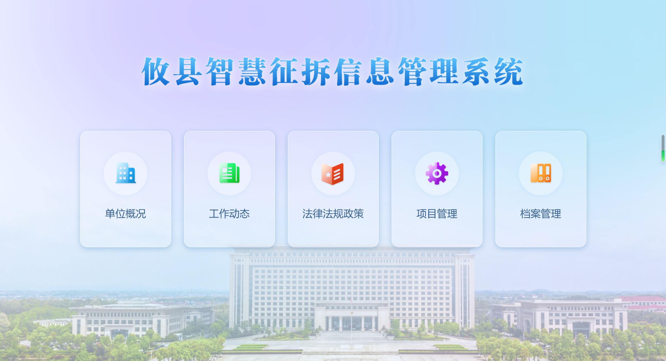 该系统举全中心之力,历时半年有余,充分结合了一线工作人员的实践经验,经过二百余次的推敲、完善;制定了一系列切实可行的文书模板;涵盖了征拆征收项目全过程。智慧系统包含单位概况、工作动态、法律法规政策、项目管理、档案管理五个模块,以征收数据为核心,搭建从公告、实物调查、结果公示、签订协议、腾房交地等全方位、一体化的征拆征收信息管理平台,具有自动生成、痕迹管理、三级审核等功能。形成标准化工作流程、动态更新,实现数据的实时、高效、快捷、准确传递掌握,达到提供决策支持、提高管理效率的目的。