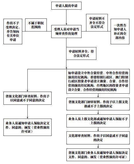 省级文化主管部门负责本行政区域内设立内资演出经纪机构的审批,省级文化主管部门受理窗口负责申请受理、证件送达。