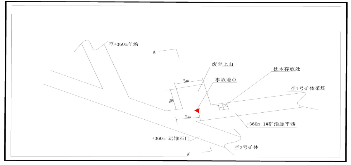 事故发生地点+360m中段西翼1号矿沿脉运输巷开门处前2m处。
