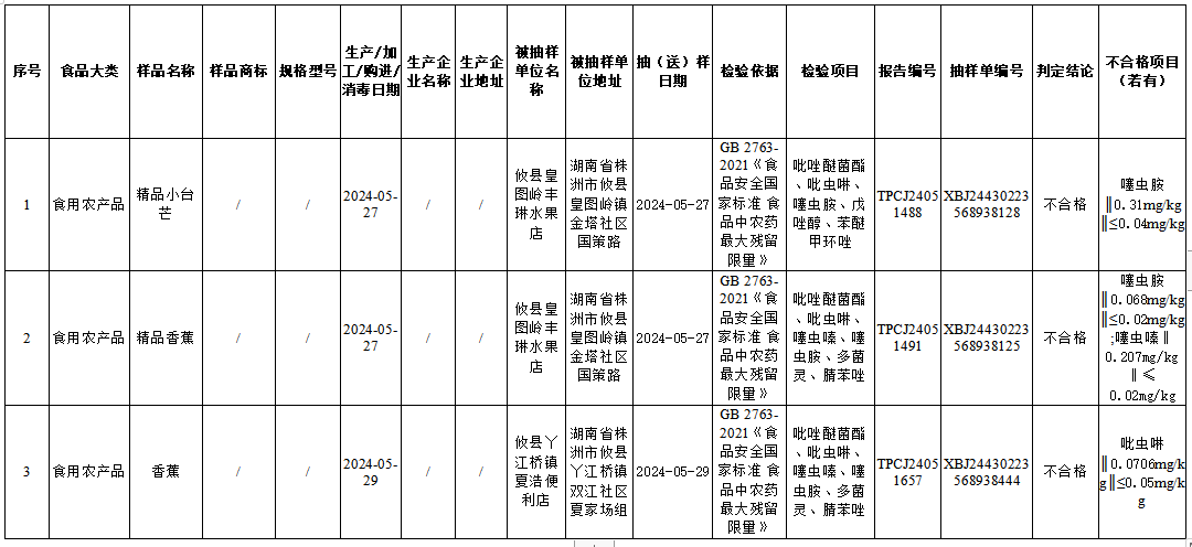 攸县市场监督管理局2024年第二季度食用农产品监督抽检信息公示(不合格3批)
