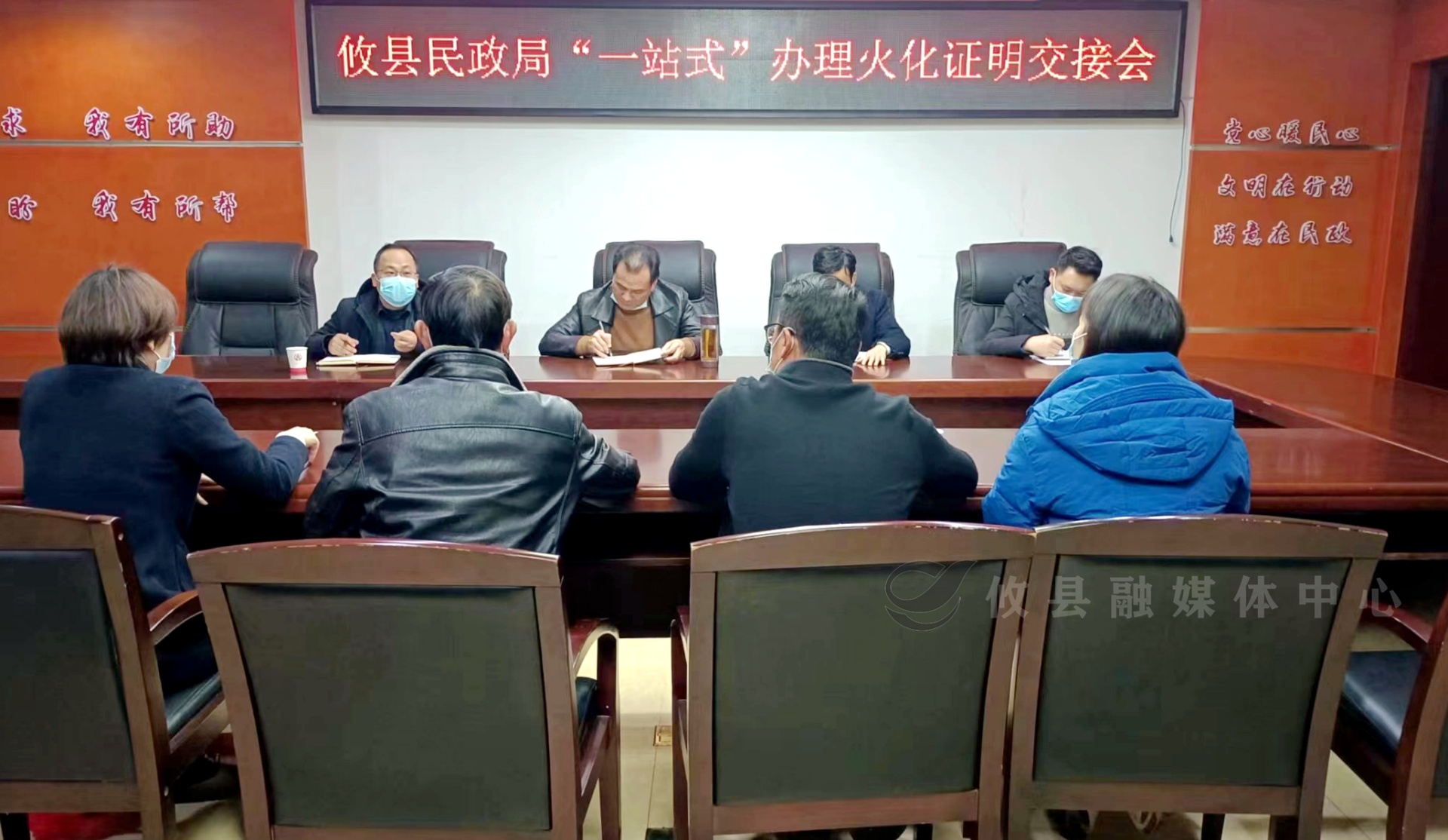 为持续深化殡葬改革工作,做好群众身后事办理的后半篇文章,县民政局决定通过流程再造和信息共享,与殡仪馆进行交接,实行“一站式”办理火化证明,解决居民身后事材料多、多头跑、环节冗、耗时长等问题,打通殡葬改革“最后一公里”,让群众少跑腿。