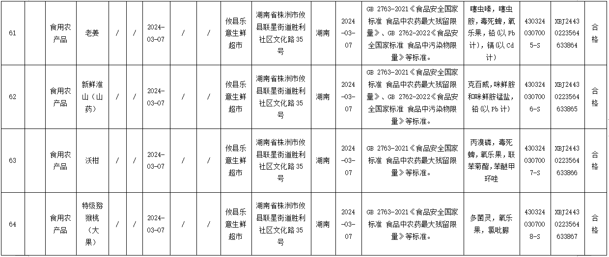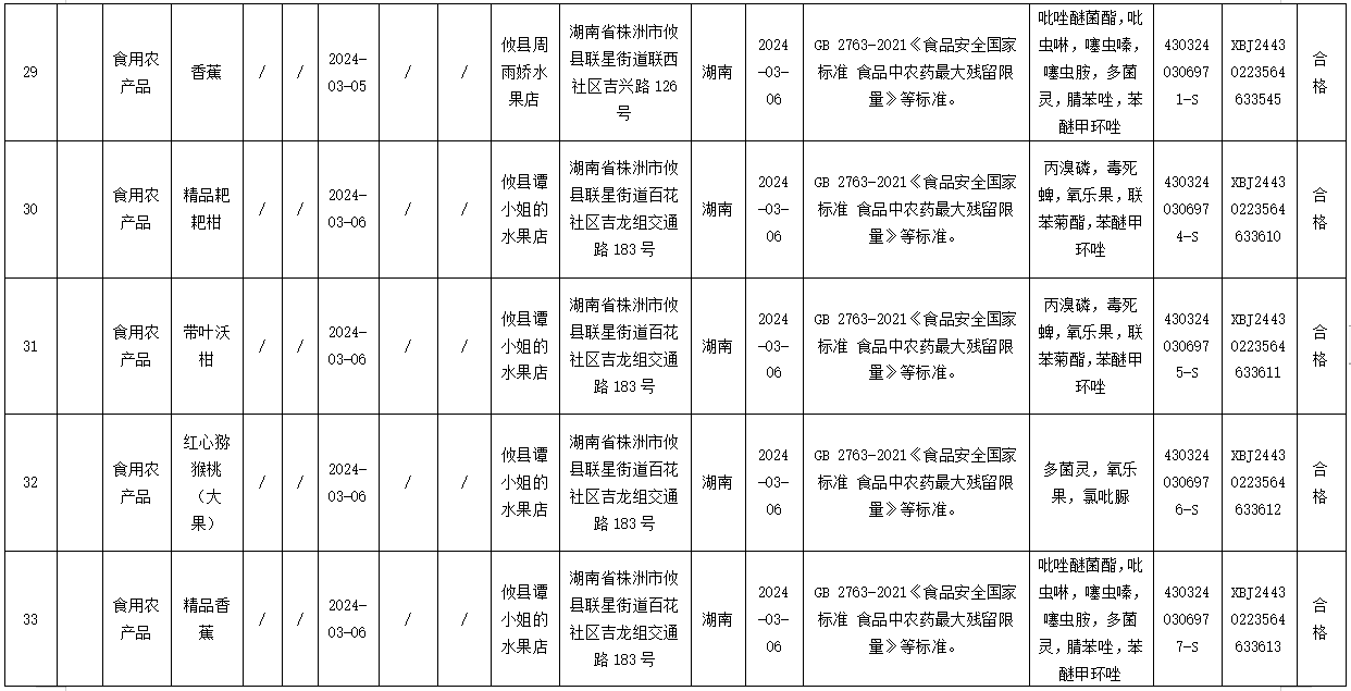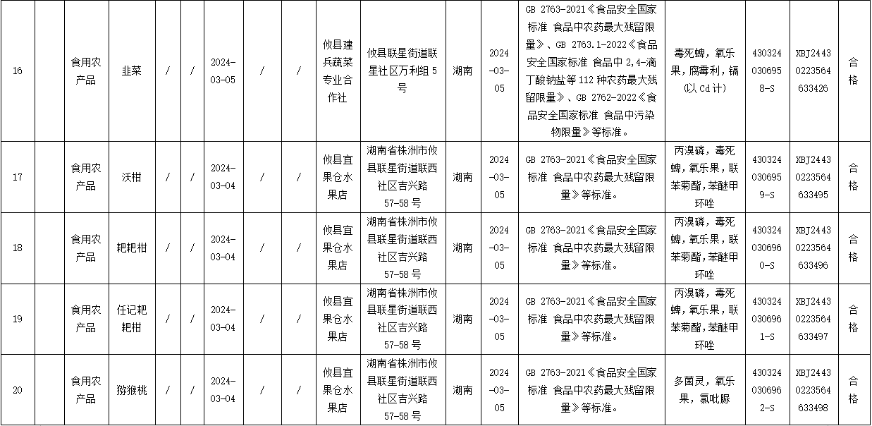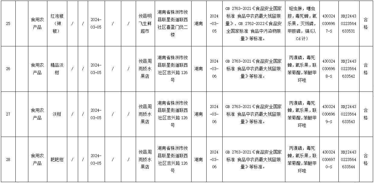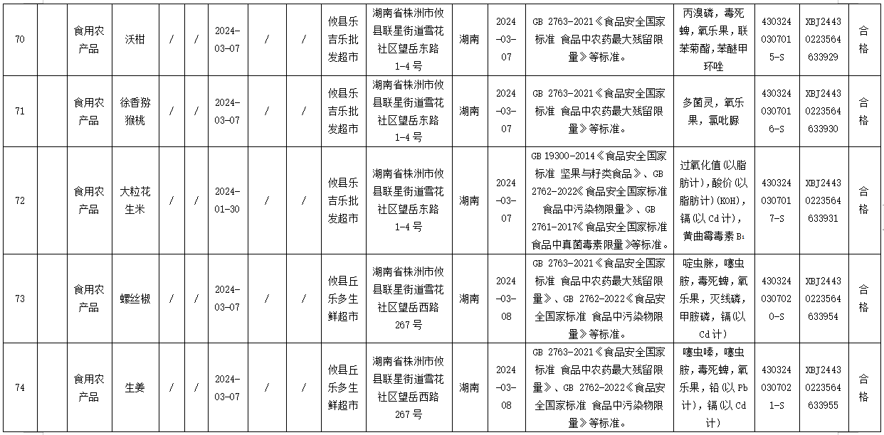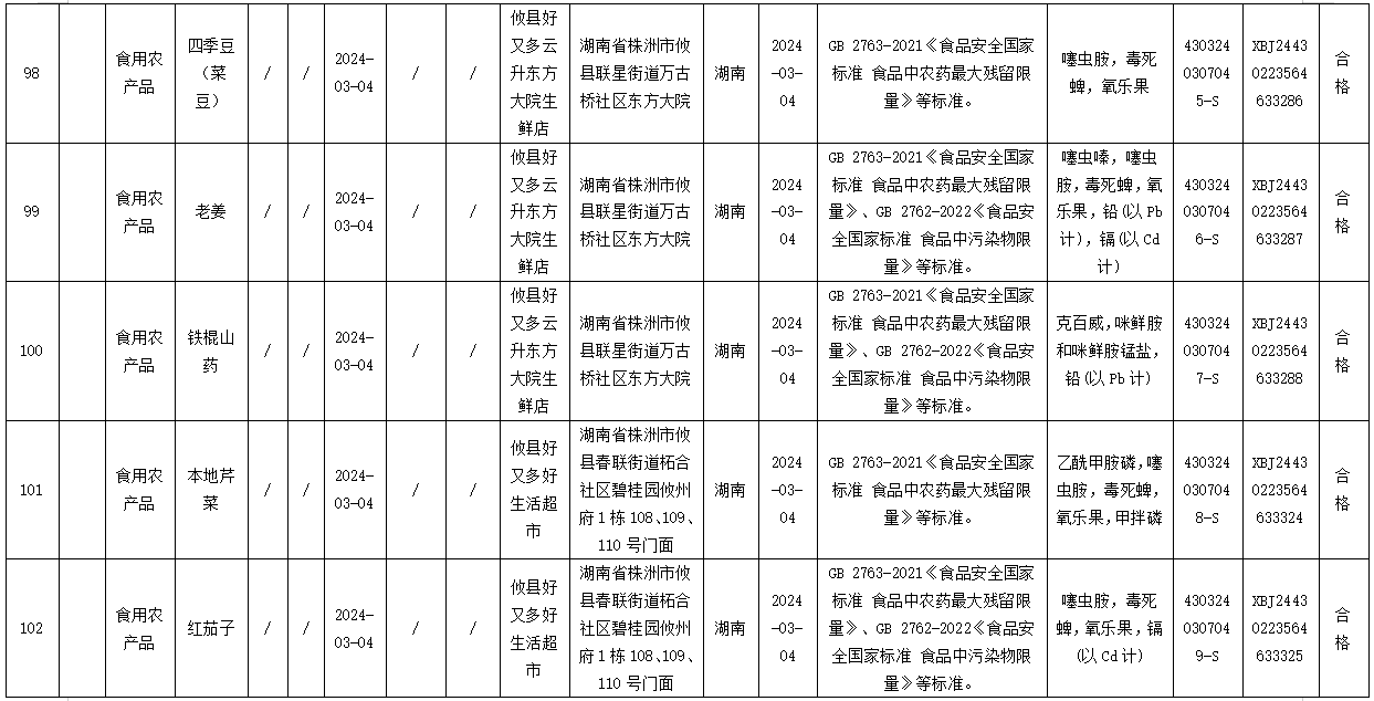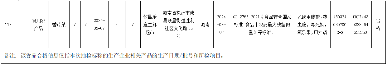 攸县市场监督管理局2024年第一季度食用农产品抽检信息公示(合格113组)