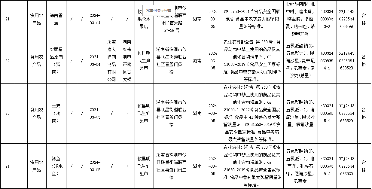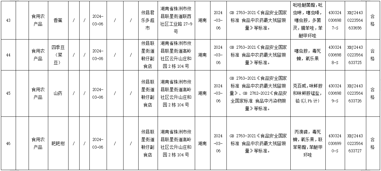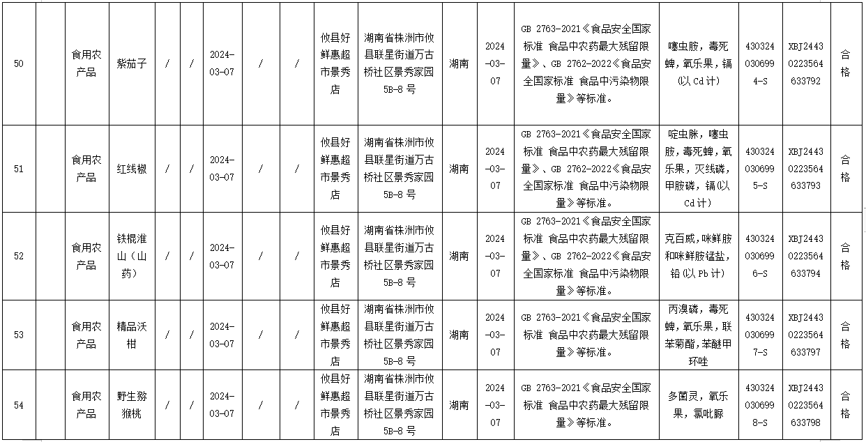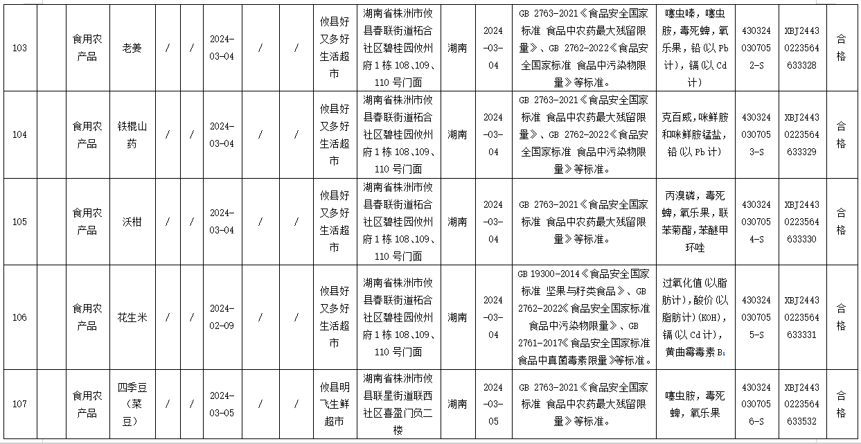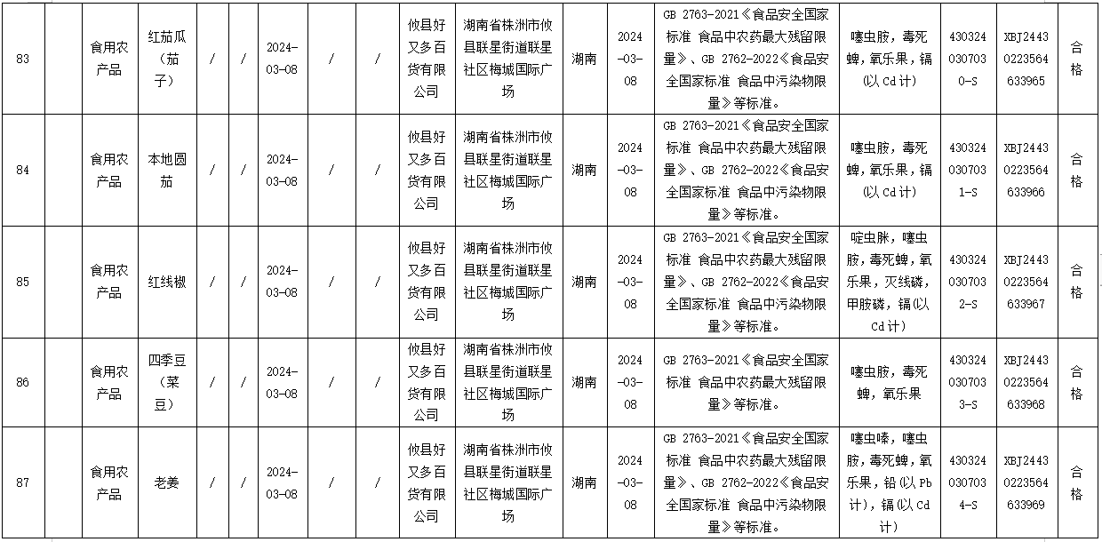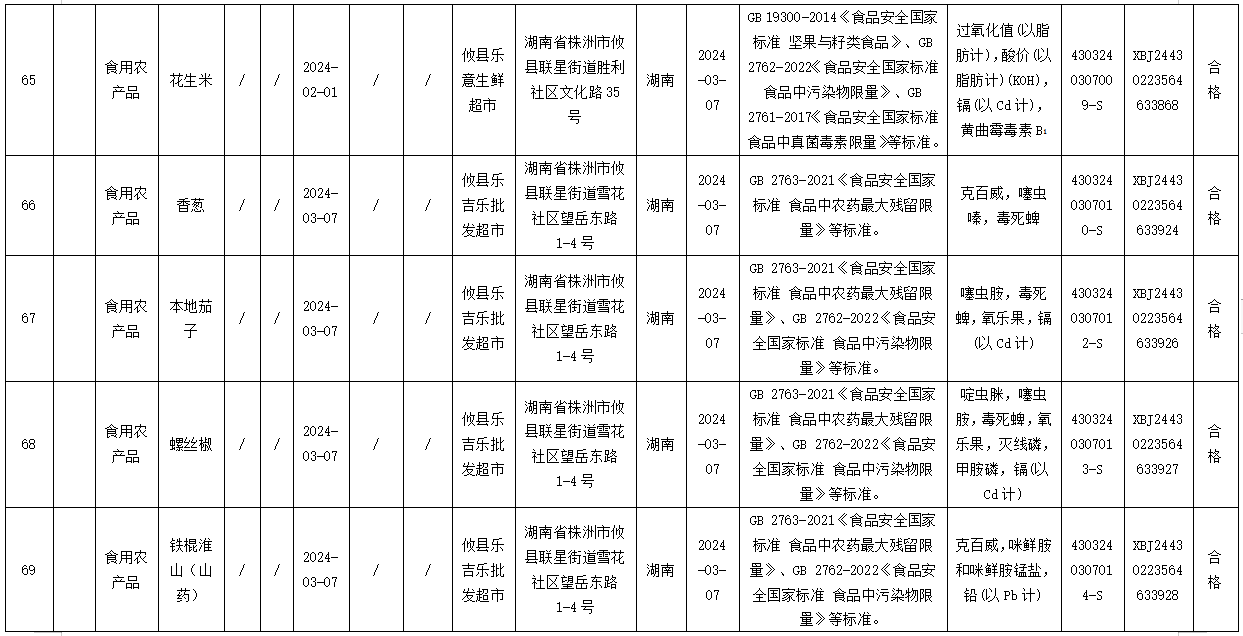 攸县市场监督管理局2024年第一季度食用农产品抽检信息公示(合格113组)