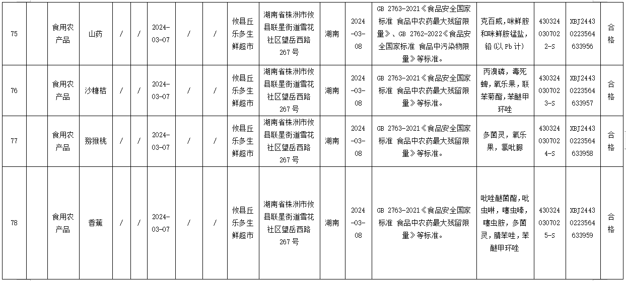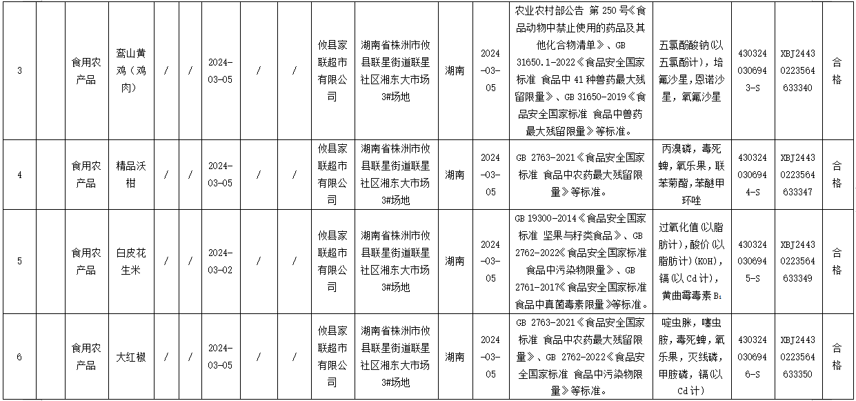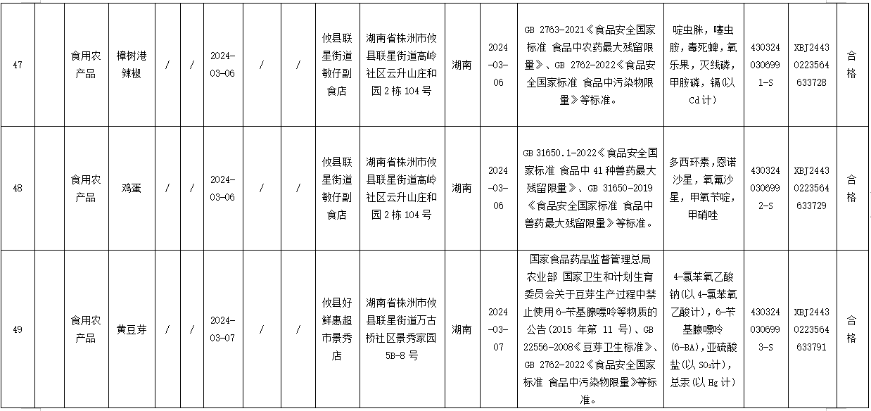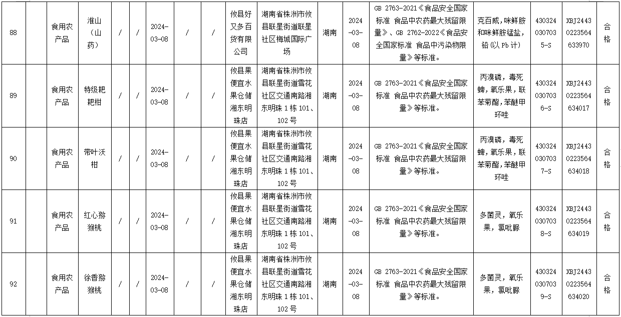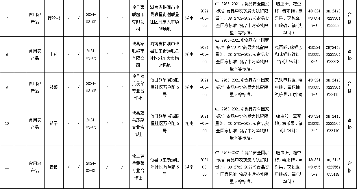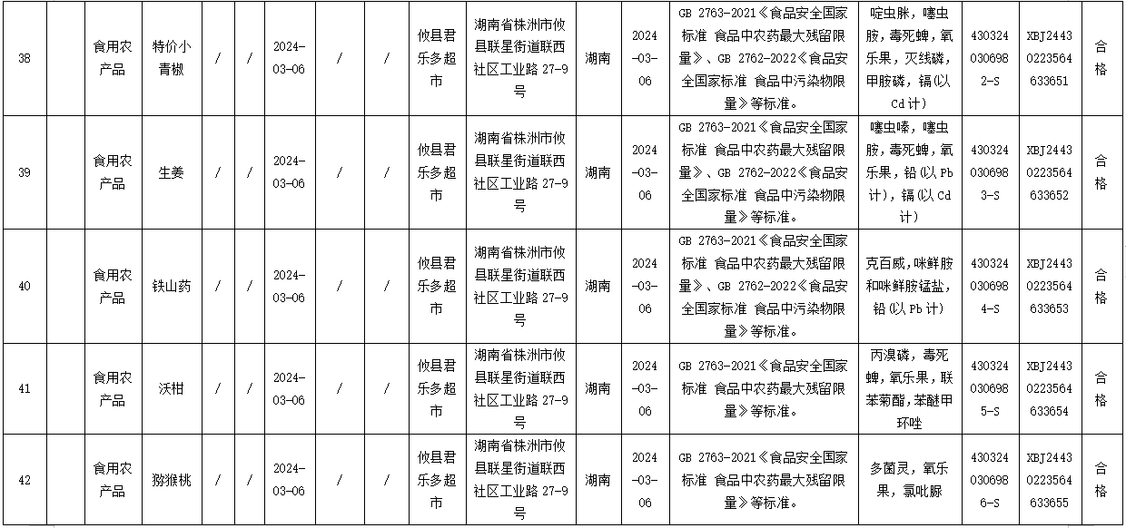 攸县市场监督管理局2024年第一季度食用农产品抽检信息公示(合格113组)