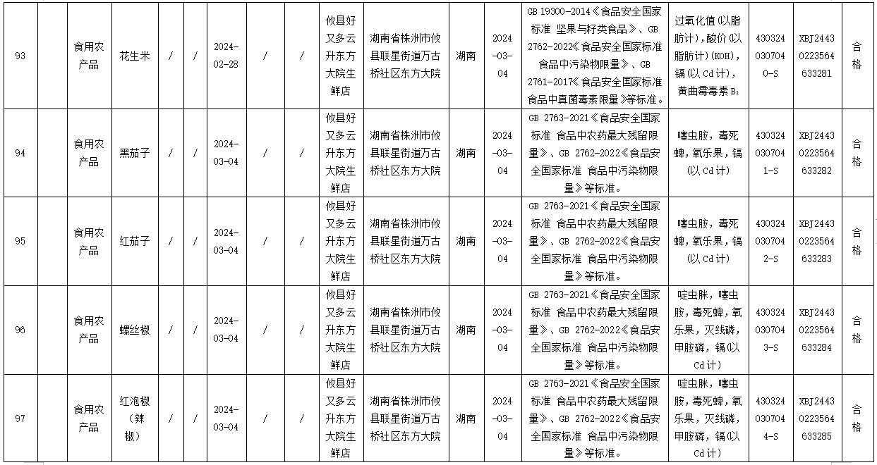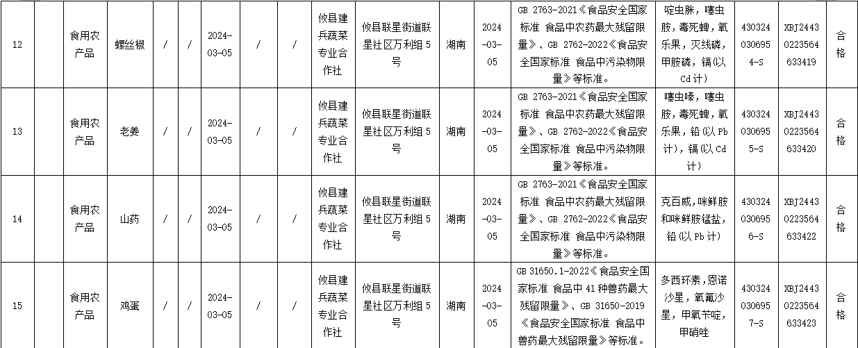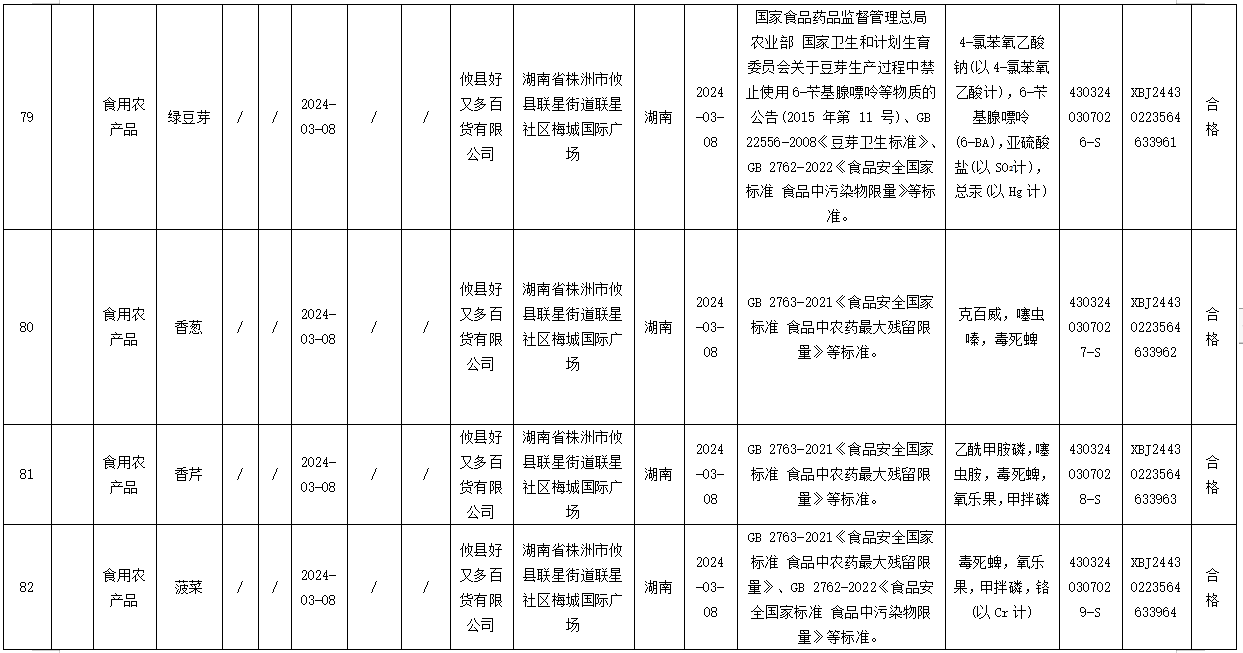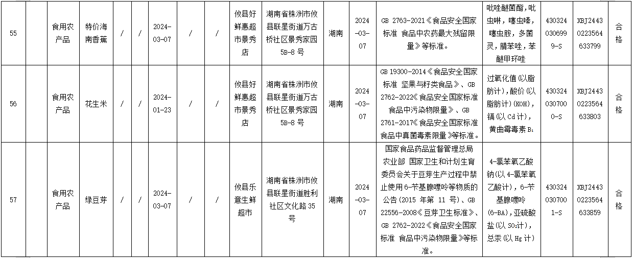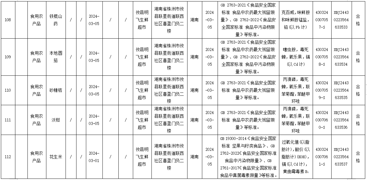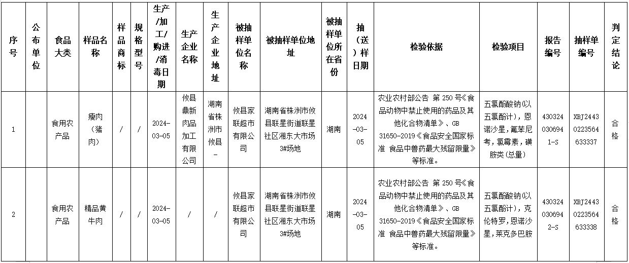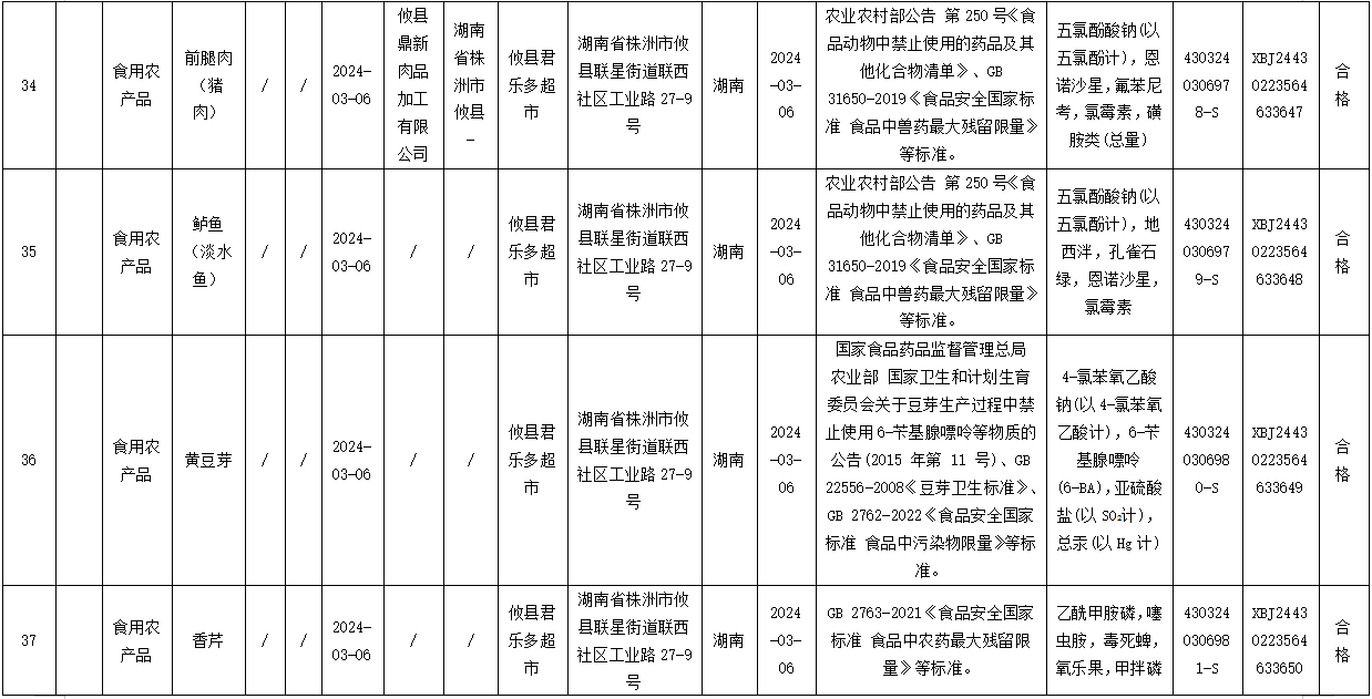 攸县市场监督管理局2024年第一季度食用农产品抽检信息公示(合格113组)