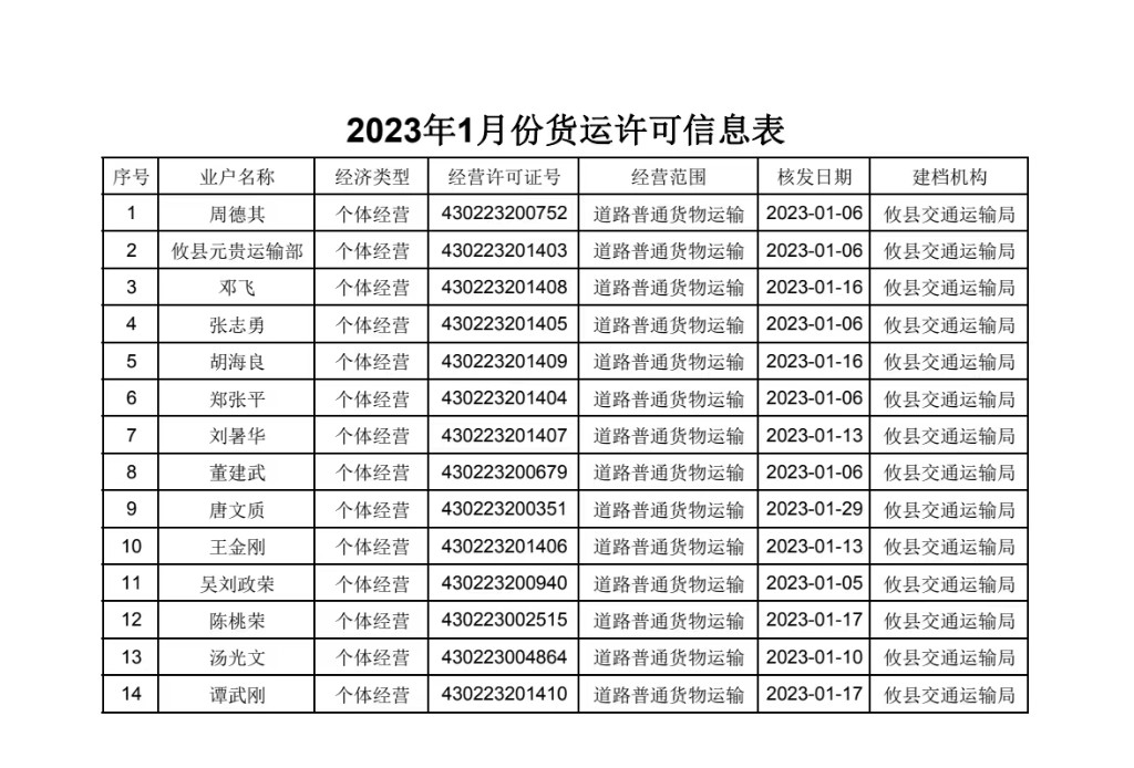 2023年1月份货运许可信息表