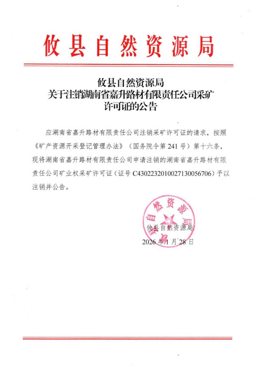 攸县自然资源局关于注销湖南省嘉升路材有限责任公司采矿许可证的公告
