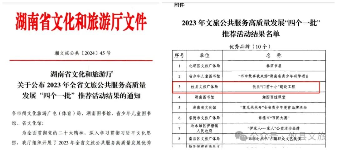 为进一步健全现代公共文化服务体系,持续推进公共文化服务创新发展,2023年,湖南省文旅厅在全省开展文旅公共服务高质量发展“四个一批”推荐活动,总结深受群众欢迎、广受社会好评,具有较强示范性、引领力、辨识度的文旅公共服务鲜活经验。经过单位申报、市州推荐、专家评审等环节,全省共有40个项目进入公示名单,其中,株洲攸县“门前十小”建设工程入选“优秀品牌”。