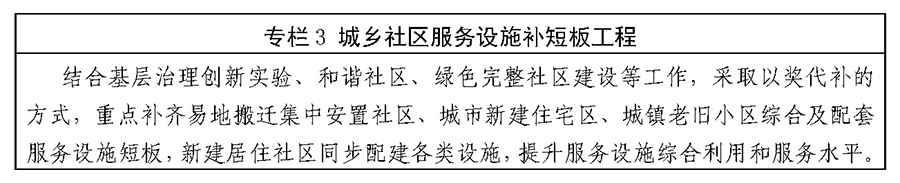 3.健全服务设施网络。巩固拓展基层公共服务“一门式”全覆盖成果,对已有村(社区)综合服务设施但面积狭小、功能不全、明显满足不了服务需求的,采取整合闲置资源、原址改扩建或新建等办法进行优化升级。结合城市有机更新和县城城镇化建设,统筹推进社区综合服务设施标准化、规范化建设,确保新建社区商业和综合服务设施面积达标、功能完善。加大盘活存量资产政策支持力度,鼓励通过换购、划拨、租借等方式,将机关企事业单位闲置公房、村(社区)综合服务设施闲置空间和非必要办公空间、住宅楼底层商业用房等符合条件的存量房屋资源增设为服务设施,支持国有企业以及资产管理公司通过资产收购处置、实质性重组、市场化债转股等方式盘活社区闲置资产,推动社区闲置低效资产改造转型,开发用于养老托育等社区服务新功能。鼓励商务楼宇、商圈市场和较大企业因地制宜开展城市社区综合服务体建设。加强较大自然村和居民小区服务设施建设,补齐既有居住社区设施建设短板,增加基本公共服务供给,推动绿色发展理念融入社区建设和居民生活。加快易地搬迁集中安置社区综合服务及配套服务设施建设,中央和省级财政衔接推进乡村振兴补助资金对集中安置区社区综合服务设施建设予以适当补助。