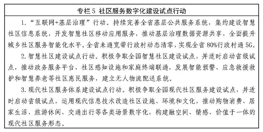 9.构筑美好数字服务新场景。统筹推进智慧社区基础设施建设,推动社区服务和管理功能综合集成,完善线上线下相结合的智慧社区服务体系。推进数字社区服务圈、智慧家庭建设,加快提升社区和家庭互联网宽带接入能力,促进社区家庭联动智慧服务生活圈发展。培育推广数字化应用场景,支持利用互联网、物联网、区块链、大数据、云计算、人工智能等现代信息技术,开展议事协商、养老、家政、卫生、托育、消防、安防等社区治理服务。大力发展社区电子商务,探索推动无人物流配送进社区。以县(市、区)为单位,深入组织开展智慧社区、现代社区服务体系试点建设。加快推进国家智能社会治理实验社区治理领域特色基地建设。