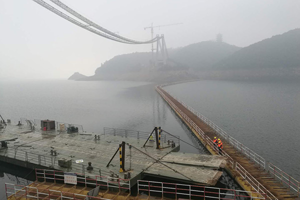 冬天的薄雾中,两条巨大的钢筋缆线如同一条巨龙将酒仙湖的林湾休闲区和攸女仙境连接在一起。工人正在将架设在湖面的浮桥拆除。施工过程中架设的浮桥,承担着桥的施工材料和人员运输的功能,最大限度地减少了施工对环境的影响。