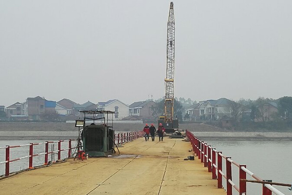 尽管只是临时施工栈桥,但其却是保证各类材料、设备供应和人员流动的生命线,因此其强度、刚度和稳定性等受力性能也是至关重要。苏辰建设集团有限公司攸县洣水四桥及连接线建设项目工程桥梁主管张远锋说:这个栈桥,每一个点的承重是80吨,比如正在作业的这个履带式吊车,自重加承重50吨左右,像这样的车子一路排过去是没有一点问题的。