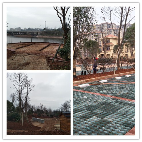 在四亩湖公园一期建设工地,工人们正在为小广场地面铺设砖块、为绿化地带种植绿植,现场一派繁忙景象。