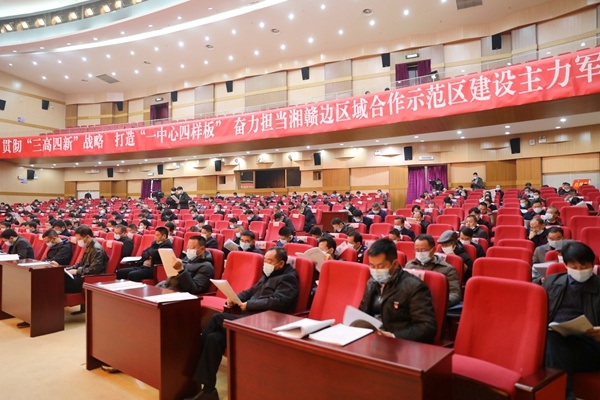 县委书记康月林代表县委常委会作了题为《贯彻“三高四新”战略,打造“一中心四样板”,奋力担当湘赣边区域合作示范区建设主力军》的工作报告。