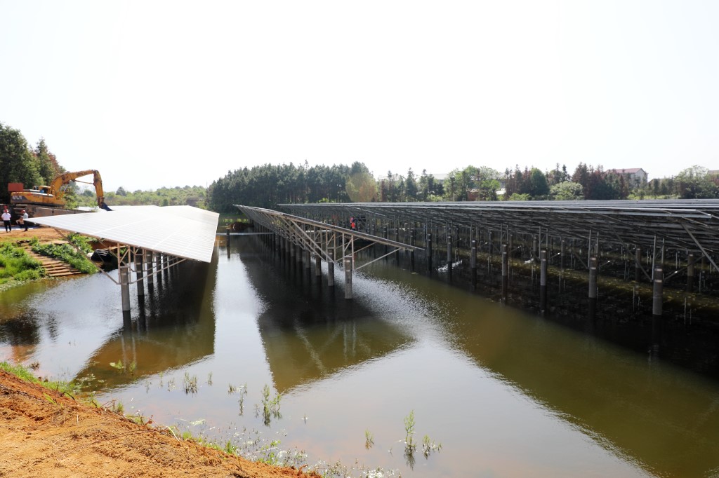 坑塘水面分布式光伏项目是攸县300MW(兆瓦)地面分布式光伏项目之一,也是全省首个分布式光伏发电项目,由株洲中车时代电气股份有限公司开发建设。目前该项目一期施工地块500余亩,投资额约1.35亿元,采取“渔光互补”模式进行开发,即在鱼塘水面上方架设光伏板阵列,光伏板下方水域进行鱼虾养殖,形成“上可发电、下可养鱼”的发电新模式。