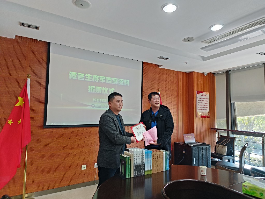 县档案馆负责人表达了对将军的敬意和谢意,表示这次谭将军捐赠的档案书籍资料弥足珍贵,对于充实和丰富馆藏档案资源,对于发掘利用红色资源开展革命传统教育、爱国主义教育具有重要的价值和意义。县档案馆将全力保管好、利用好这批档案资料,传承红色基因,厚植爱国情怀,服务家乡建设。