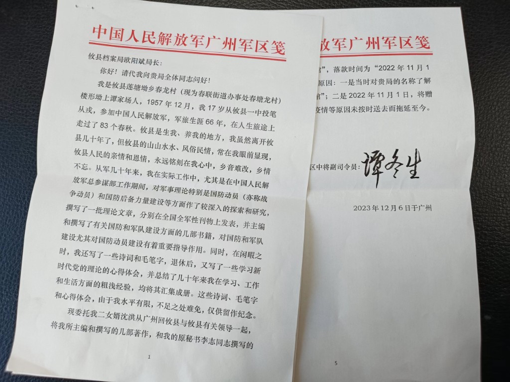 12月6日,中国人民解放军原广州军区中将副司令员谭冬生将军委托其女婿沈洪先生向攸县档案馆捐赠了一批个人书籍,共9种30本,其中由谭冬生主编和撰写的著作有:《战争动员学》《中国军事百科全书·战争动员分册》《中华人民共和国兵役法释义》《国防动员建设纵谈》《家传箴言》《悟道——谭冬生诗书》《攸县春联街道办事处春塘龙村谭家场谭氏族人之根源》和《高举党旗永向前》,由谭冬生原秘书李志同志撰写的著作《征途荣光——戎马一生的谭冬生将军》,每本书都有将军的亲笔签名。同时带来一封谭冬生将军写给档案馆负责人的信,信中详细介绍了所捐赠的书籍,以及对家乡的思念之情,情真意切的桑梓情怀令人动容。