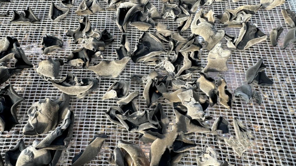 11月7日,记者在春风社区黑木耳基地看到,一桩桩黑木耳菌棒整齐排列,菌棒上长满了密密麻麻的黑木耳,20多位村民将一朵朵饱满的木耳从菌棒上采摘下来,随后将一桶桶新鲜的黑木耳立即送往大棚里进行晾晒,基地内一派繁忙景象。自从春风社区引进发展黑木耳种植以来,周边村民利用农闲时间便可以到基地来务工,每天有80元的劳务收入。