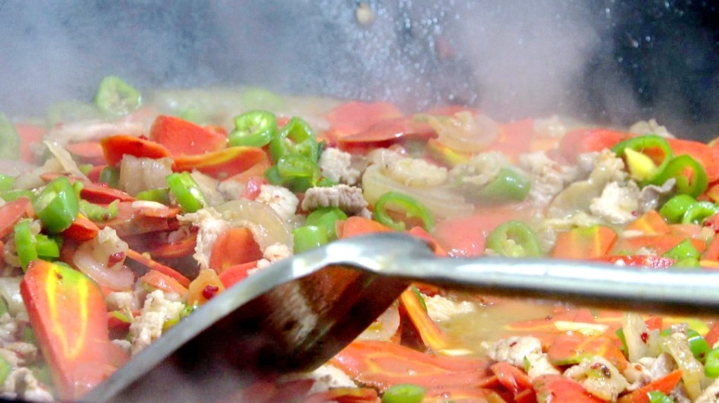 临近中午,盘龙村“长者食堂”里渐渐热闹起来,村里的老人们三五成群相伴而来。食堂今天中午的菜谱是红萝卜炒肉,豆腐三丝,茼蒿菜和筒骨海带汤,老人们只要花上四块钱,便可吃到可口的午餐。