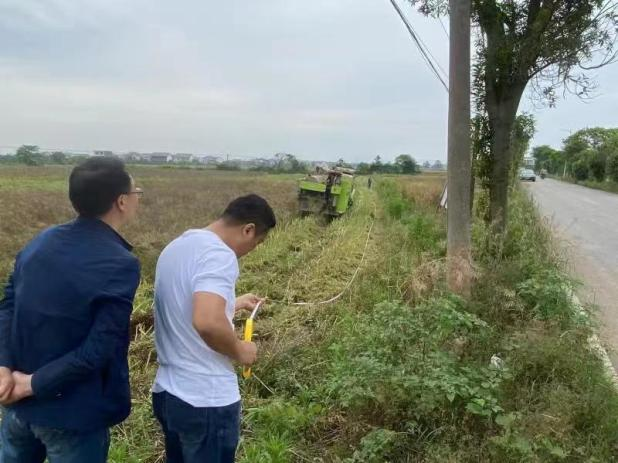 监测现场,工作人员先根据油菜作物条件和地块条件划定2个田块面积相同的测区,测区内等距取3个测点,在各测点选择适合的油菜株距,放置3个接样槽,样机满幅收获作业30分钟后,测定实际作业面积和收获籽粒总质量。取出接样槽,对接样槽所接收的损失籽粒进行称重,在根据这些测试数据测算出不同地块油菜收获的机收损失率,通过不同田块的机收总损失率的比对分析机收损失原因,总结出更好的机收减损降耗方法。