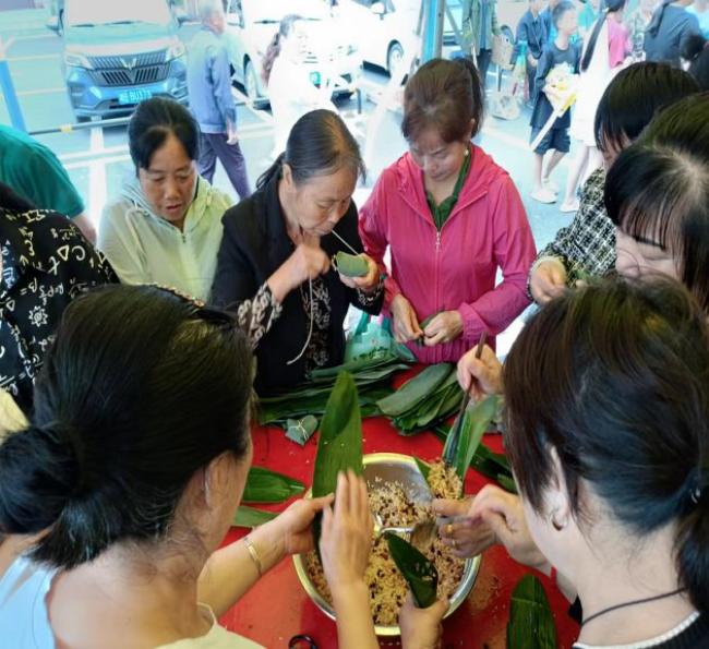 欢声笑语"迎端午","粽"享和谐邻里情。在景秀家园小区,大家齐聚一堂,开展了包粽子迎端午主题活动。活动现场,志愿者为大家讲解端午节的由来、习俗及爱国诗人屈原的故事,让居民深入了解端午文化以及赛龙舟、吃粽子、挂艾草等传统习俗。随着糯米、红枣、花生等各式各样的粽料端上,大家开心地拿起粽叶,动手包起了粽子,不一会儿,形状各异的粽子摆满了桌面。现场还开展了"十米画廊"、"快乐滚滚乐"、"党史知识问答"、"预防电信诈骗"等活动。辖区居民纷纷表示感受到了社区的关怀,大家学到了非遗技艺,增加了幸福感,温馨的气氛洋溢在整个活动现场。