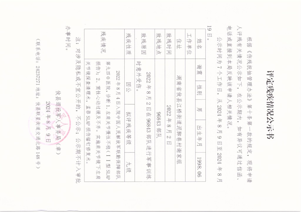 根据《伤残抚恤管理办法》第十条第一款的规定,现将申请人评残有关情况公示如下,公示时间从2024年8月9日至2024年8月19日,在公示期内,如有异议可通过信函、电话或直接到本局反映该申请人相关情况,联系电话:24237271。