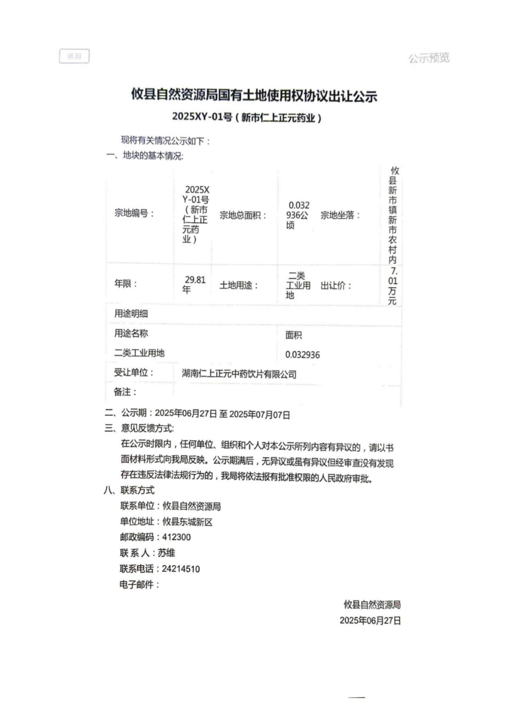 攸县自然资源局国有土地使用权协议出让公示