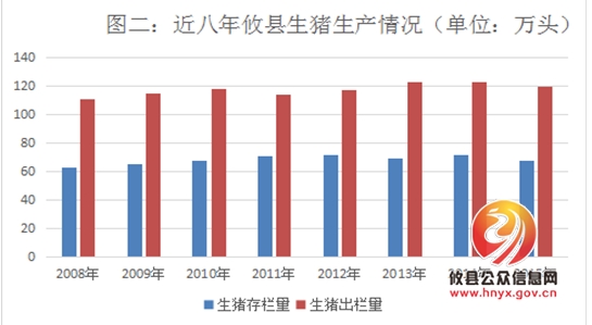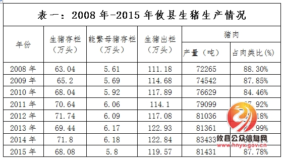 我县是全国的生猪调出大县。从2008年到2015年,我县生猪生产总体保持稳定增长,生猪年出栏量均在110万头以上;生猪年末存栏量都有60万头以上;能繁母猪年末存栏量都在5.5万头以上;猪肉产量都在7000吨以上,位居全省前茅。这八年猪肉占肉类总量的比重87%左右,始终是肉类供给的总体(注:出栏量为累计数、存栏量为时点数。)