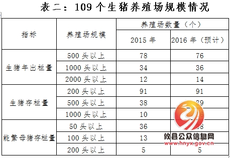 从上表可以得知,尽管前两年淘汰大量能繁母猪,但由于去年年底行情好转,利用一年半的时间,我县的生猪养殖规模还是保持一定较高的水平,今年较去年相比,规模化程度有小幅提高。统计调查的109个养殖场,生猪年出栏量2015年达162206头,2016年预计达179070头,同比增长10.40%;生猪年末存栏量2015年达76207头,2016年达87879头,同比增长15.32%;能繁母猪年末存栏量2015年达9316头,2016年达9618头,同比增长3.2%。