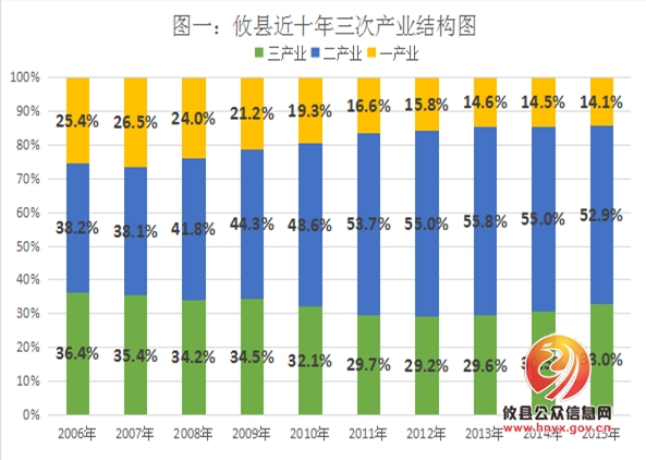 成为三次产业中绝对主导的产业。进入九十年代以后,随着乡镇企业异军突起和大量的城乡剩余劳动力向经济发达的沿海地区和大城市转移,攸县的产业结构得到很大的调整和很好的优化。1998年,攸县三次产业结构调整为35:38:27,第二产业所占比重首次超过第一产业的比重。劳务输出队伍带来了巨大的资金流入和消费观念的彻底转变,服务业成为了调整经济结构和转变发展方式的主要动力。2001年,全县三次产业结构调整为34.2:29.5:36.3,表明攸县经济发展方式正在向农业、工业、服务业协调拉动转变。2006年-2013年,以煤炭、铁矿石等开采为主的采矿业迎来了一波“黄金周期”,带动了商贸业、运输业等行业快速发展,第二、三产业的比重逐年上升,第一产业的比重逐步下降,三次产业比越来越得到优化,其中第一产业占比为14.6%、第二产业占比为55.8%、第三产业占比为29.6%。2014年以来,全国煤炭市场行情低迷,攸县的经济发展受到很大的冲击,第二产业占GDP的比重在逐渐下降,第三产业占比逐渐回升。从第一、第二、第三产业的发展历程情况来看,攸县第一产业增加值整体呈下降趋势,第二产业增加值比重呈现出上升趋势,第三产业增加值一直比较平稳,波动不大。总体来看,攸县的产业结构变化主要是在农村产业的比重逐渐向第二产业和第三产业变迁的过程,随着经济发展水平的提高,农业在GDP的比重会越来越低,工业或服务业占GDP的比重会不断上升。