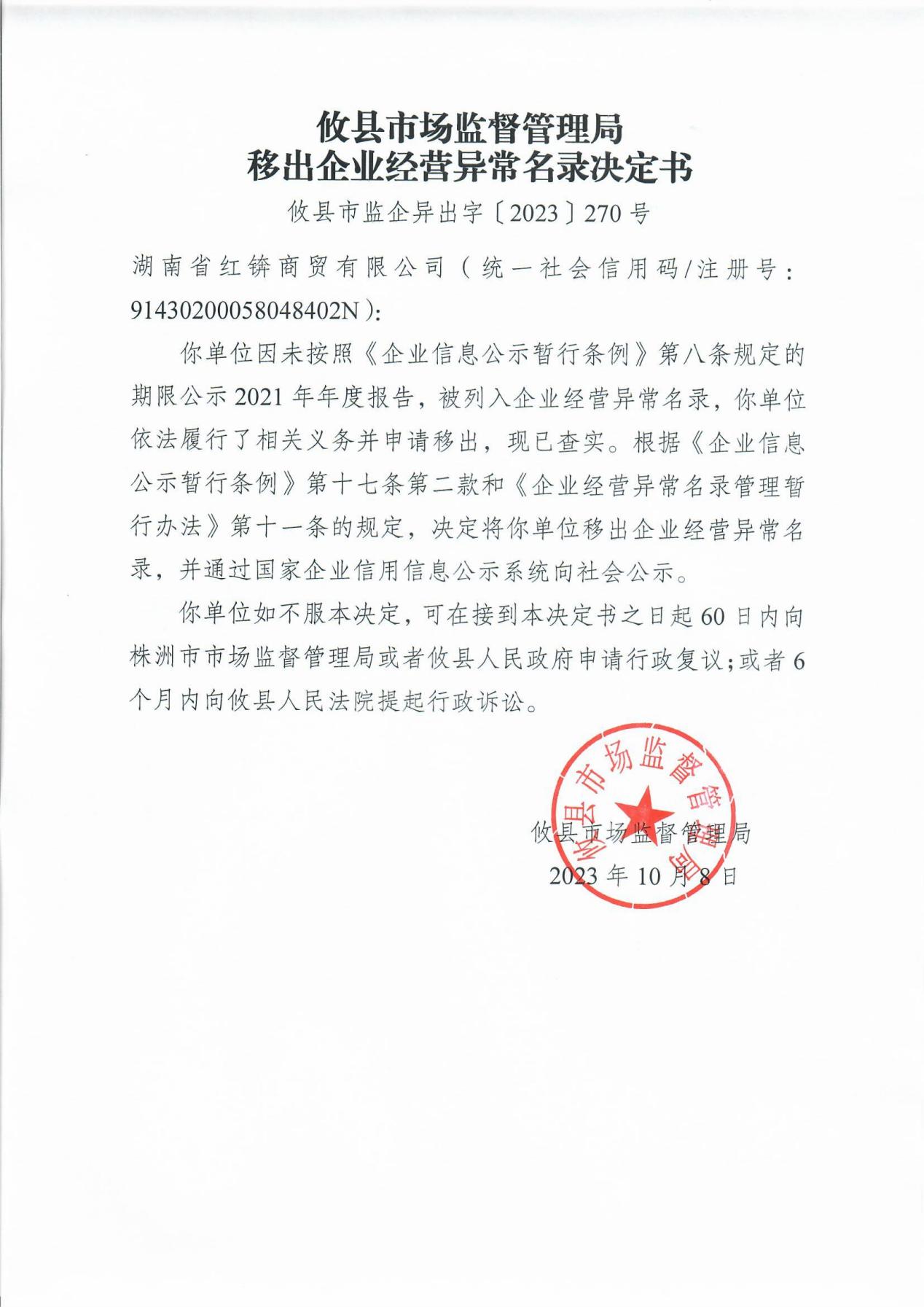 攸县市场监督管理局移出企业经营异常名录决定书(攸县市监企异出字〔2023〕270号)