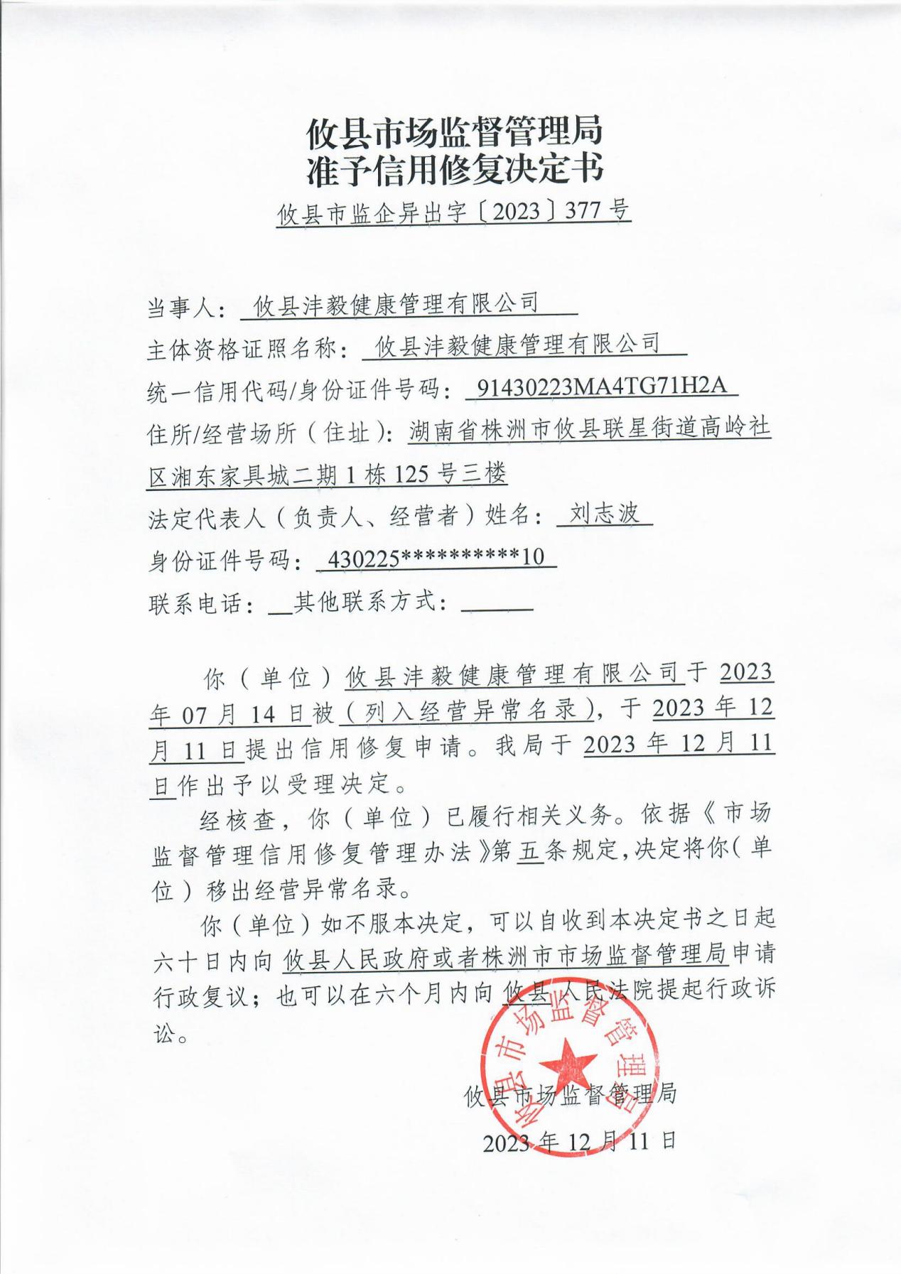 攸县市场监督管理局准予信用修复决定书