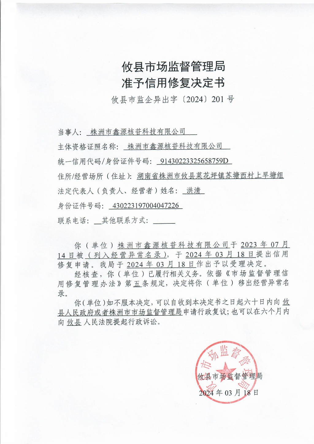 攸县市场监督管理局准予信用修复决定书