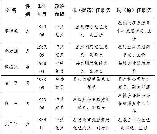 为了加强对干部选拔工作的监督,提高识别和任用干部的准确程度,现对县委常委会议研究决定的下列6名拟调任人选进行任前公示: