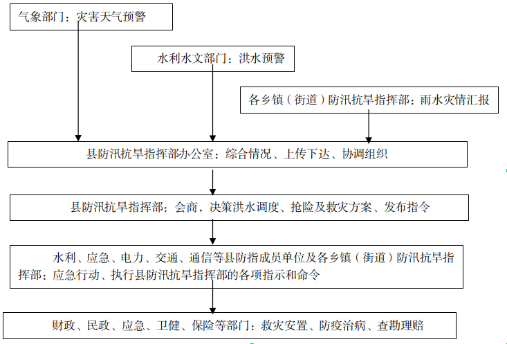 (5)全县重要的抢险工作由县防汛抗旱指挥部统一指挥,各乡镇(街道)各部门具体执行。一般性抢险救灾工作仍由各地区、各部门按预案职责分工组织实施;