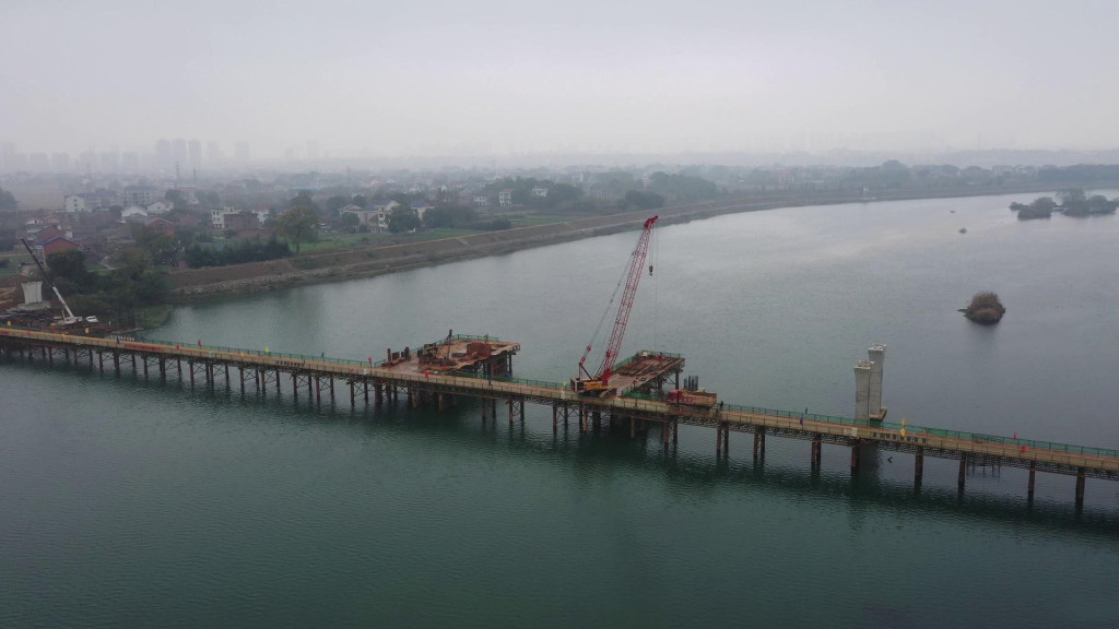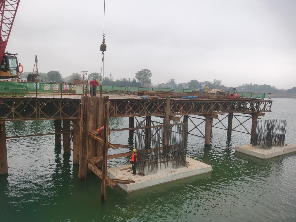 洣水四桥项目建设有序推进 水面四个桥墩钢架基本完成