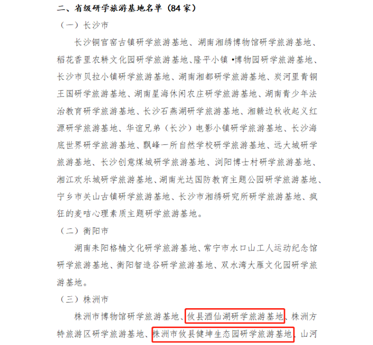2021年12月29日,湖南省研学旅游质量等级认定委员会公示了2021年度湖南省研学旅游(示范)基地名单,酒仙湖研学旅游基地和健坤生态园入选2021年省级研学旅游基地。