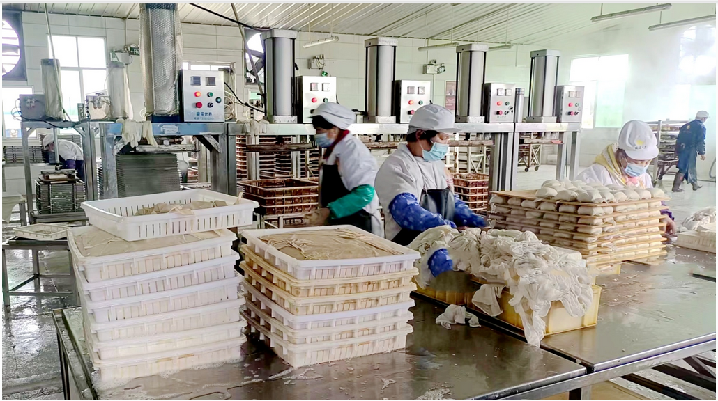 走进位于联星街道大屋村的盛玉坊食品有限公司,厂房里热气腾腾,豆香味浓郁,工人们在各自的工作岗位上忙碌着。他们中的大部分人是来自大屋村的农民。